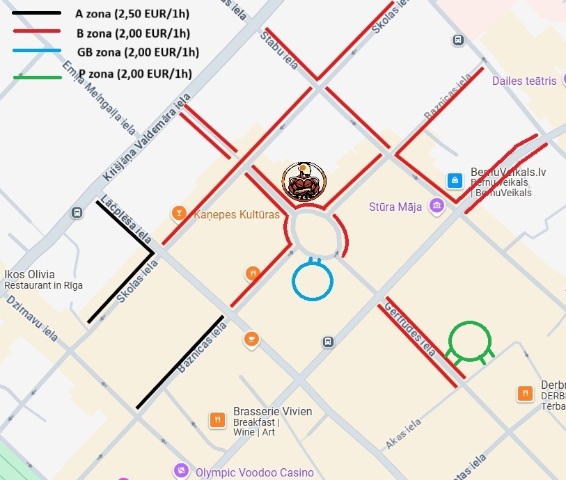 Mobilly A zona (pirmā stunda 2,50 EUR/h, bet katra nākamā 3,00 EUR/h) darba dienās 8:00-20:00, kā arī sestdienās 9:00-17:00. Apmaksājama Mobilly lietotnē.